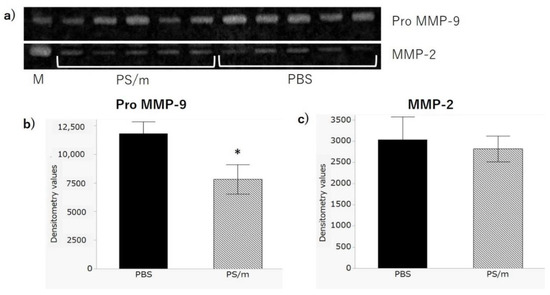 Gelatin zymography of AAA lysates. (a) Image of gelatin zymography. Upper bands (92 kDa) represent pro-matrix metalloproteinase (MMP)-9, and lower bunds (64 kDa) represent MMP-2. Samples are the AAAs of rats treated with PBS (n = 5) and PS/m 5 mg/kg (n = 5). MMP marker was applied in the left lane (M). (b) Gelatinase activity of pro-MMP-9. The activity of the group treated with PBS was significantly higher than the group treated with PS/m. (c) Gelatinase activity of MMP-2. There was no significant difference between the groups. * p < 0.05. Error bars denote the standard error of the mean.