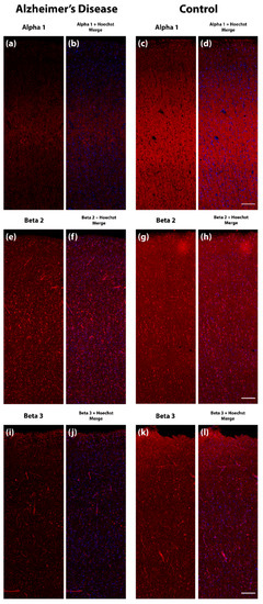- Mizukami, K.; Ikonomovic, M.D.; Grayson, D.R.; Rubin, R.T.; Warde, D.; Sheffield, R.; Hamilton, R.L.; Davies, P.; Armstrong, D.M. Immunohistochemical study of GABAA receptor β2/3 subunits in the hippocampal formation of aged brains with Alzheimer-related neuropathologic changes. Exp. Neurol. 1997, 147, 333–345. [Google Scholar] [CrossRef]