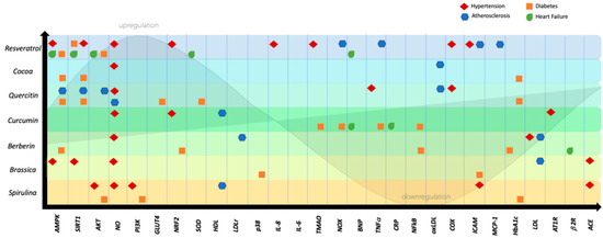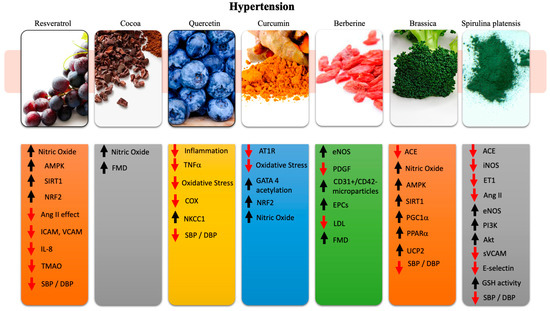 Summary of the main molecular and physiological effects exerted by resveratrol, cocoa, quercetin, curcumin, brassica, berberine, and Spirulina platensis in hypertension. Red arrow (↓) indicates downregulation; black arrow (↑) indicates upregulation.