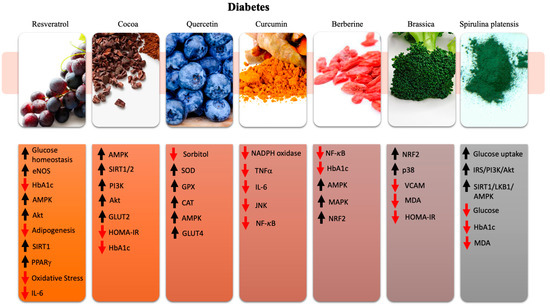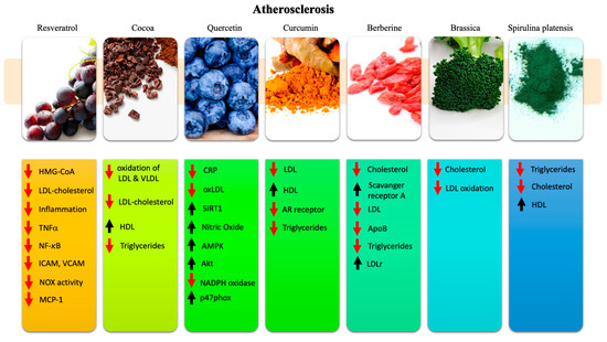 Summary of the main molecular and physiological effects exerted by resveratrol, cocoa, quercetin, curcumin, brassica, berberine, and Spirulina platensis in the atherosclerotic process. Red arrow (↓) indicates downregulation; black arrow (↑) indicates upregulation.
