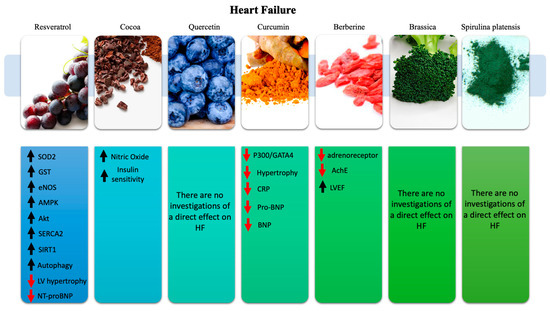 Summary of the main molecular and physiological effects exerted by resveratrol, cocoa, quercetin, curcumin, brassica, berberine, and Spirulina platensis in HF. Red arrow (↓) indicates downregulation; black arrow (↑) indicates upregulation.