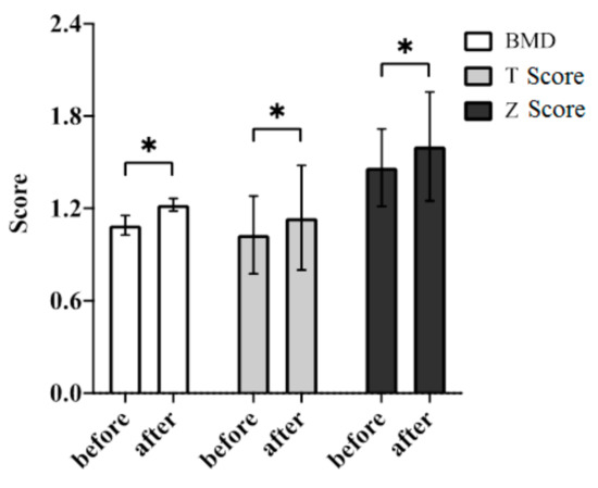 Therapeutic effects of Cinacalcet on parameters of BMD in the whole study population. Note: * represents the p-value < 0.05 to compare the differences between the two indicated groups by Mann–Whitney Rank Sum Test.