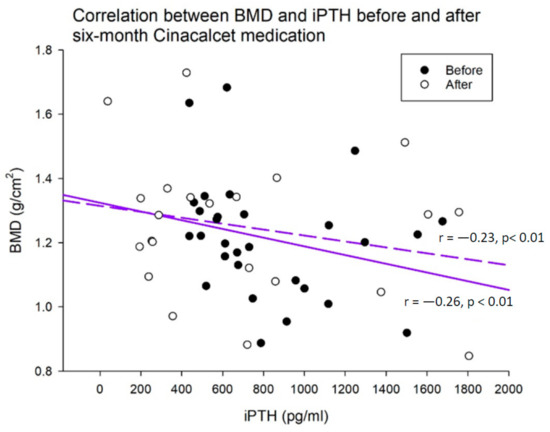 Correlations between BMD and iPTH before (dash line) and after (solid line) six-month treatment of Cinacalcet. A significantly inverse correlation exists between BMD and iPTH before and after treatment. Compared with the pre-treatment slope, the post-treatment slope increases inversely, suggesting that BMD improvement is correlated with suppression of iPTH.