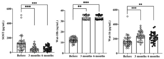 As shown in Figure 3, SOST, an inhibitor of canonical Wnt/β-catenin signaling that reduced bone formation, was decreased from baseline 127.3 ± 102.3 pg/mL to 52.8 ± 33.3 and 57.9 ± 33.6 pg/mL at the 3rd and 6th month, respectively (p < 0.001). Furthermore, Wnt-10b/Wnt 16 expressions were increased from baseline 12.4 ± 24.2/166.6 ± 73.3 pg/mL to 33.7 ± 2.1/239.1 ± 60.4 pg/mL and 33.8 ± 2.1/217.3 ± 62.6 pg/mL at the 3rd and 6th month, respectively (all p values < 0.01).