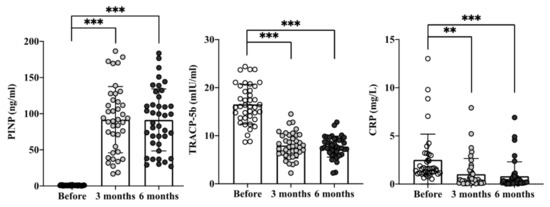 Cinacalcet treatment upregulates PINP expression to activate osteoblasts responsible for bone formation and downregulates TRACP-5b expression to inhibit osteoclastic bone resorption along with CRP suppression at the 3rd and 6th month. Quantitative data were analyzed with a paired Student’s t-test. ** p < 0.01; and *** p < 0.001 to compare the differences between the two indicated groups.