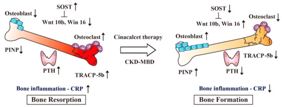 - Zheng, C.-M.; Hsu, Y.-H.; Wu, C.-C.; Lu, C.-L.; Liu, W.-C.; Zheng, J.-Q.; Lin, Y.-F.; Chiu, H.-W.; Chang, T.-J.; Shyu, J.-F.; et al. Osteoclast-Released Wnt-10b Underlies Cinacalcet Related Bone Improvement in Chronic Kidney Disease. Int. J. Mol. Sci. 2019, 20, 2800. [Google Scholar] [CrossRef] [PubMed]