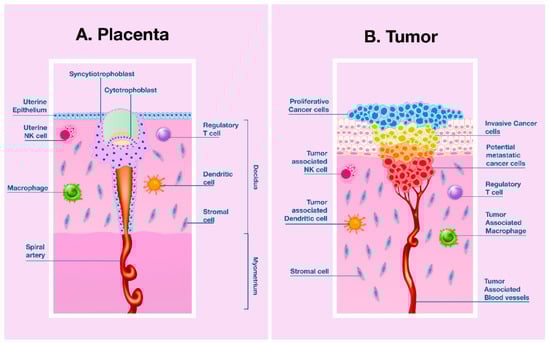 Human placentation and malignancy share proliferative and invasive features to establish a nutrient supply and evade or modify the host’s immune response. (A) Human placenta development. In the early stage of implantation, the blastocyst displays an invasive phenotype that allows implanting inside the endometrial stroma. In this process cytokines, growth factors, hormones, extracellular matrix metalloproteinases (MMPs), and immune cells, all modulate cell invasion of maternal decidua and myometrium and their capacity to transform spiral arteries. Among growth factors, placental growth factor (PlGF) secreted by the decidua, trophoblast, and uterine natural killer (uNK) cells have a determinant role in regulating invasion, vascular development, and maternal immune tolerance mechanisms to semi-allogeneic fetus; (B) Tumor invasion and progression. Malignancy is able to create both a vascular network that warrants perfusion of tumor mass and an immunosuppressive microenvironment by recruiting specific immune cells. Molecules (cytokines, growth factors, extracellular MMPs), produced by tumor and inflammatory cells in the tumor microenvironment, recruit (tumor-associated) immune cells, thus, creating a tolerogenic milieu that inhibits the development of an efficient immune response against cancer cells that foster tumor growth and progression. PlGF blockade reduces both neoangiogenesis and lymphangiogenesis, inhibits the M2 macrophages polarization, hinders the recruitment of tumor-associated macrophages (TAM), and decreases the recruitment of myeloid suppressor cells []. (Illustration inspired by Holtan et al. [] with kind permission of Elsevier, License Number: 4911830648497).