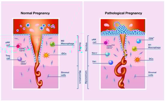 During pregnancy, NK cells are the predominant population of lymphoid immune cells in the uterus at the maternal-fetal interface and are involved both in placental vascular remodeling and in a mother’s immune tolerance [,,,,,,].