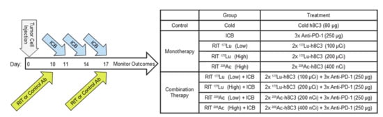 Male DBA/2 mice bearing Cloudman S91 with approximately 150 mm3 sized tumors were randomized into the groups of five and treated with either: a dose of 80 µg unlabeled (cold) h8C3 on day 10 and 17 after tumor cell inoculation; three doses of 250 µg anti-PD-1 mAb on days 11, 14, and 17 as in Curran et al. []; two doses of RIT on day 10 and 17; three doses of anti-PD-1 mAb on days 11, 14, and 17 and two dose of RIT on day 10 and 17. Two different isotopes, 177Lu and 225Ac, were used as a low and a high dose. The RIT doses were as follows: 100 µCi 177Lu-h8C3 (Low) and 200 µCi 177Lu-h8C3 (High) and 200 nCi 225Ac-h8C3 (Low) and 400 nCi 225Ac-h8C3 (High). The full treatment timeline is shown in Figure 1. The weight of the mice was measured every three days and the blood samples were collected and examined weekly for WBC and RBC counts. The mice were humanely sacrificed as described in the animal use protocol when they reached the Humane Intervention Point (HIP) defined in our animal protocol.
