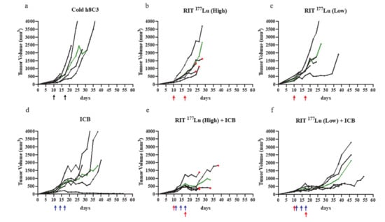 Combination study of anti-PD1 mAb vs. RIT with 177Lu-h8C3 mAb. The mice in groups of five were treated with: (a) two doses of unlabeled (cold) h8C3 anti-melanin mAb on day 10 and 17 after S91 Cloudman tumor cell inoculation; (b) two doses of 200 μCi (High) of 177Lu-h8C3 mAb on day 10 and 17 (RIT 177Lu High); (c) two doses of 100 μCi (Low) of 177Lu-h8C3 mAb on day 10 and 17 (RIT 177Lu Low); (d) three doses of 250 μg anti-PD1 mAb on day 11, 14, and 17 (ICB); (e) three doses of 250 μg anti-PD1 mAb on day 11, 14, and 17 with two doses of 200 μCi (High) of 177Lu-h8C3 mAb on day 10 and 17 (RIT 177Lu High + ICB); (f) three doses of 250 μg anti-PD1 mAb on day 11, 14, and 17 with two doses of 100 μCi (Low) of 177Lu-h8C3 mAb on day 10 and 17 (RIT 177Lu Low + ICB). Day 0 is the day of tumor cell inoculation. Each black tumor volume curve represents a single animal; green line—median tumor volume in the group. Black, blue, and red arrows indicate the injection of cold antibody, anti-PD1 antibody, and RIT, respectively. Red dots indicate the death of the animal from radiotoxicity.