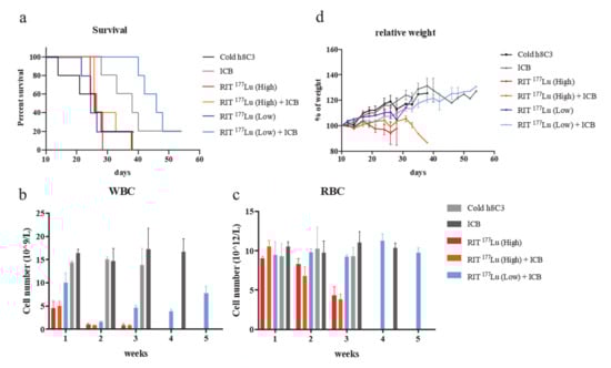 The combination of 177Lu RIT (low) with ICB (Figure 2f) resulted in significant reduction in the rate of tumor growth, as determined by calculating tumor volume doubling time (Td), when compared to the cold h8C3 control group (p = 0.004), to the 177Lu RIT (low) monotherapy (p = 0.027), and to the ICB monotherapy (p = 0.047); in addition to demonstrating prolonged median survival ranging from 8 to 20 days (Table 1, Figure 3a). In contrast, neither 177Lu RIT (high) monotherapy (Figure 2b), or the combination of 177Lu RIT (high) with ICB treatment (Figure 2e) resulted in any significant decrease in tumor growth, or extension of survival (Table 1, Figure 3a). In terms of toxicity, low-dose 177Lu RIT in combination with ICB was well tolerated with minimal hematologic toxicity upon 5 weeks of treatment. (Figure 3b,c) and the maintenance of body weight (Figure 3d), whereas the 2 doses of 200 µCi of 177Lu RIT monotherapy or in combination with ICB reached the maximum tolerated dose as indicated by extreme weight loss (Figure 3d) and decreased white blood cell (WBC) and red blood cell (RBC) counts that did not recover (Figure 3b,c).
