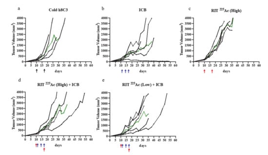 Combination study of anti-PD1 mAb vs. RIT with 225Ac-h8C3 mAb. The mice in groups of five were treated with: (a) two doses of unlabeled (cold) h8C3 anti-melanin mAb on day 10 and 17 after S91 Cloudman tumor cell inoculation; (b) three doses of 250 μg anti-PD1 mAb on day 11, 14, and 17 (ICB); (c) two doses of 200 nCi (High) of 225Ac-h8C3 mAb on day 10 and 17 (RIT 255Ac High); (d) three doses of 250μg anti-PD1 mAb on day 11, 14, and 17 with two doses of 200 nCi (High) of 225Ac-h8C3 mAb on day 10 and 17 (RIT 255Ac High + ICB); (e) three doses of 250 μg anti-PD1 mAb on day 11, 14, and 17 with two doses of 100nCi (Low) of 225Ac-h8C3 mAb on day 10 and 17 (RIT 255Ac Low + ICB). Day 0 is the day of tumor cell inoculation. Each black tumor volume curve represents a single animal, green line—median tumor volume in the group. Black, blue, and red arrows indicate the injection of cold antibody, anti-PD1 antibody, and RIT, respectively.
