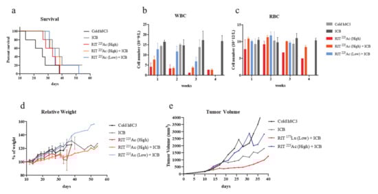 Survival of DBA/2 mice bearing S91 Cloudman tumor cells treated with anti-PD1 mAb and/or RIT with 255Ac-h8C3 mAb and toxicity evaluation. (a) Survival. Unlabeled h8C3 antibody (cold), ICB, high/low doses of RIT 255Ac with/without ICB treatment. (b) WBC count in RIT 255Ac with/without ICB treatment. (c) RBC count in RIT 177Lu with/without ICB treatment. (d) Relative body weight. Percentage of the body weight was calculated based on each animal’s weight at day 10 when the first treatment was administered. (e) Median tumor volume curves for monotherapy and combination studies.