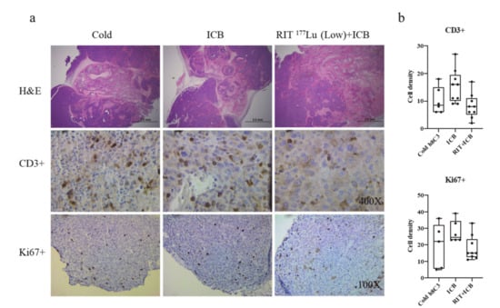 H&E staining and IHC staining of tumors. Panel (a): First row, H&E staining of tumors from cold h8C3, ICB, and RIT 177Lu (low) + ICB treatment groups. Second row, anti-CD3 IHC staining under 400X magnification; brown staining surrounds the nuclear indicate the CD3+ cells. Bottom row, anti-Ki67 IHC staining under 100X magnification, and brown staining overlaps with the nuclear indicate the Ki67+ cells. Panel (b): upper row—number of CD3-positive cells in cold h8C3, ICB, and RIT + ICB treatment group; lower row—number of Ki67-positive cells in cold h8C3, ICB, and RIT + ICB treatment group.