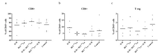 Flow cytometry data for determination of tumor-infiltrating T cells for possible synergistic effects between anti-PD1 and 177Lu-h8C3 antibody. Groups of four tumor-bearing mice (three treatments of anti-PD1), single injection of 177Lu, three treatments of anti-PD1 followed by one treatment of 177Lu-8hC3, and one treatment of 177Lu-h8C3) or six mice (control) were treated and sacrificed on day 20. Tumors were harvested and analyzed by (a) comparing % of CD8+ cells among CD45+ cells, (b) comparing % of CD4+ cells among CD45+ cells, and (c) comparing % of Treg+ cells among CD45+/CD4+/foxP3+ cells for each cohort. Each data point represents one animal in each group. No significance was found in any treatment group relative to control.