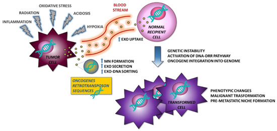 Proposed model for the formation of metastases. Tumor cells under stress conditions secrete exosomes, which transport oncogenes capable of inducing malignant transformation in normal recipient cells and contribute to the formation of the pre-metastatic niche also controlling the immune environment. MN—micronuclei.
