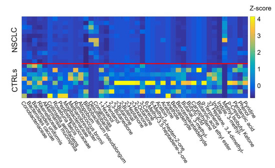 In lung cancer studies, a different pool of metabolites, i.e., ketones, esters, aldehydes and alcohols, were considered in order to discriminate among groups of patients [17]. However, the specific biological matrices affected both the qualitative and quantitative profiles of the final set of possible biomarkers [29,30].