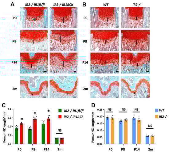 The zone of hypertrophic chondrocytes is enlarged in iR2−/−iR1∆Ch mice compared to controls. (A,B) Sections of the distal femoral growth plate from iR2−/−iR1fl/fl controls or iR2−/−iR1∆Ch mutants (A) or from wild type (WT) or iR2−/− mice (B) at different ages (postnatal day P0, P8, P14 and 2 months (m) of age) were stained with Safranin O and Fast Green to highlight bone in light blue and cartilage and the chondrocytes in the growth plate in red. The length of the zone of hypertrophic cells is indicated by a black line in each panel. (C,D) Quantification of the results shown in panels A and B shows an increase in the length of the zone of hypertrophic cells in iR2−/−iR1∆Ch samples compared to iR2−/−iR1fl/fl controls at P0, P8 and P14, but not at 2 months (C), whereas there was no significant difference between WT and iR2−/− samples at any of these four time points (D). The scale bar represents 100 µm in each panel. * indicates statistical significance with a p-value of < 0.05 in a student’s t-test, whereas NS indicates no significant change. The quantification was performed on at least 4 samples from separate animals per day and genotype (for WT P0, n = 6; P8, n = 5; P14, n = 7; 2m, n = 9; for iR2−/− P0, n = 5; P8, n = 10; P14, n = 4; 2m, n = 6; for iR2−/−iR1fl/fl, P0, n = 10; P8, n = 12; P14, n = 7; 2m, n = 7; for iR2−/−iR1∆Ch, P0, n = 5; P8, n = 8; P14, n = 8; 2m, n = 5). Each black dot (circle, square, triangle or diamond) in the bar graphs in panels C and D represents the data from one animal in this figure and in all subsequent figures, and the error bars represent the standard error of the mean (SEM).