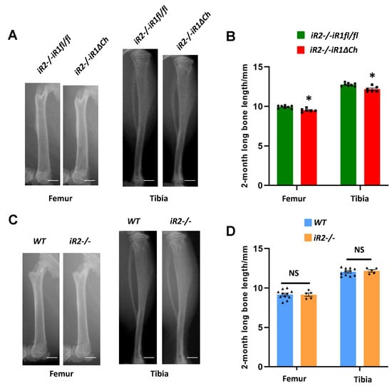 The tibiae and femurs of iR2−/−iR1∆Ch mice are slightly shorter than controls. (A) Faxitron images of a representative femur and tibia from 2-month old iR2−/−iR1∆Ch mice compared to the iR2−/−iR1fl/fl control shows that the mutant long bones are slightly, but significantly, shorter than the controls (quantification in (B) femurs ave. 4.3% shorter, +/− 0.86% SEM, tibiae ave. 4.5% shorter, +/− 1.1% SEM). (C) Faxitron images of a femur and a tibia from 2-month old WT or iR2−/− mice showed no significant difference in length, as quantified in (D). The scale bar in (A,C) is equivalent to 1 mm. * indicates a student’s t-test p-value of < 0.05, which was considered statistically significant, NS indicates no significant difference, the error bars represent the SEM. At least 5 samples from separate animals were used for quantification for each time point and genotype.