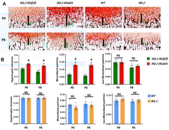 Von Kossa staining uncovers a selective enlargement of the mineralized hypertrophic chondrocytes in iR2−/−iR1∆Ch compared to controls. (A) Sections from P0 and P8 mice that were not demineralized were stained with von Kossa stain to mark the zone of mineralized hypertrophic chondrocytes adjacent to the chondro-osseous junction in black. The length of the zone of mineralized hypertrophic chondrocytes, defined as hypertrophic chondrocytes adjacent to the black von Kossa-stained material (indicated by green bars) and of the total zone of hypertrophic chondrocytes (indicated by black bars) were enlarged in iR2−/−iR1∆Ch mice compared to iR2−/−iR1fl/fl controls or compared to samples from age-matched WT or iR2−/− mice. (B) Quantification of the size of the zone hypertrophic chondrocytes and of the zone of mineralized hypertrophic chondrocytes confirmed the enlargement of both in iR2−/−iR1∆Ch mice compared to iR2−/−iR1fl/fl controls, whereas there was no significant difference in the length of the zone of non-mineralized von Kossa-negative hypertrophic chondrocytes (top panels). There was no significant difference in the length of either of these parameters between samples from age matched WT and iR2−/− mice (lower panels). * indicates a p-value of < 0.05, which was considered statistically significant, whereas NS indicates no significant difference. The scale bar indicates 100 µm. At least 4 samples from separate animals were used for each time point and genotype (WT P0, n = 8; P8, n = 4; for iR2−/− P0, n = 7; P8, n = 8; for iR2−/−iR1fl/fl, P0, n = 11; P8, n = 12; for iR2−/−iR1∆Ch, P0, n = 6; P8, n = 6). The error bars correspond to the SEM.