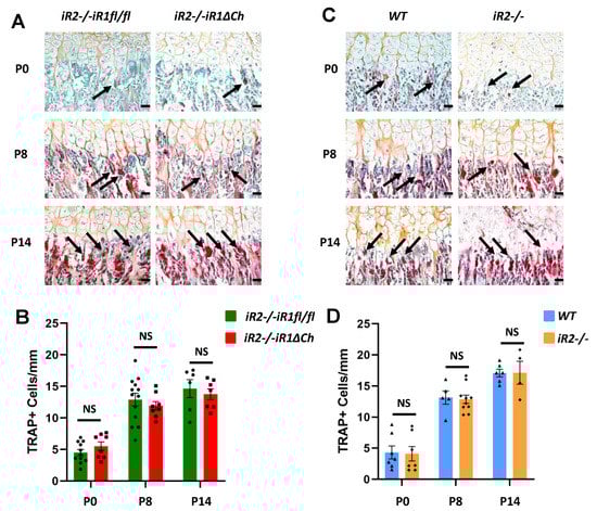 Quantification of TRAP-positive osteoclasts at the chondro-osseous junction. (A,C) TRAP stained osteoclasts (pointed by black arrows) at the chondro-osseous junction (COJ) of the distal femur growth plate of P0, P8 and P14 iR2−/−iR1∆Ch mice and iR2−/−iR1fl/fl controls (A) or of WT and iR2−/− mice (C) were quantified in a double blinded manner as number of TRAP+ cells per mm length of the COJ (quantification shown in (B,D)). NS indicates no significant difference, error bars represent SEM. The scale bar indicates 100 µm. A minimum of 4 samples from different animals were prepared for each genotype and time point.