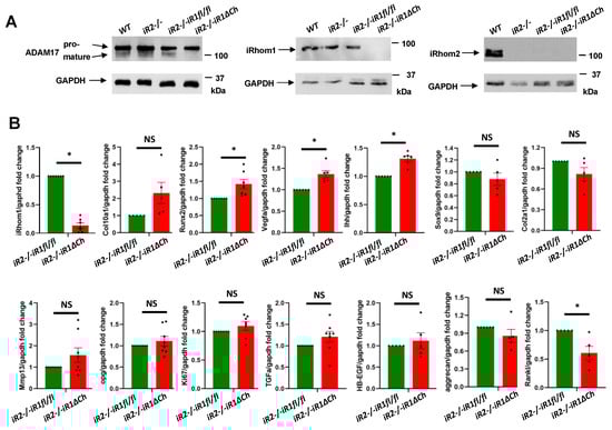 iRhom2−/− and WT control littermate mice were generated from iRhom2+/− parents on a 129Sv/C57BL/6 mixed background []. iRhom2−/−iRhom1fl/fl/Col2a1-cre mice (referred to as iR2−/−iR1∆Ch mice) were generated by crossing iRhom2−/− mice with iRhom1fl/fl mice [] as well as with Col2a1-Cre mice [] (kindly provided by Dr. Hicham Drissi, University of Connecticut, Farmington, CT, USA) with iR2−/−iR1fl/fl mice serving as controls. Genotyping for iRhom1fl/fl and iRhom2−/− was performed as described previously [,]. Genotyping for Col2a1-Cre (B6;SJL-Tg(Col2a1-cre)1Bhr/J) was performed as described by Jackson Laboratories. Matings were set up such that the Col2a1-Cre transgene was only carried on one allele in the males, and all comparisons were performed between littermates, with an equal distribution of males and females. All animal experiments were approved by the Internal Animal Care and Use Committee of Weill Cornell Medicine (Project identification number: 2015-0047, Approval date: 4 December 2019).