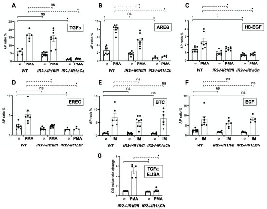 ADAM17 is crucial for the shedding and functional activation of five of the seven ligands of the EGFR (TGFα, HB-EGF, AREG, EREG and EPGN) [,,]. In addition, iRhom2 is responsible, at least in part, for the stimulated release of several of these EGFR ligands in mouse embryonic fibroblasts (HB-EGF, AREG and EREG) [], whereas iRhom1 and iRhom2 can both fully support the shedding of TGFα, the main EGFR ligand responsible for normal development of the zone of hypertrophic chondrocytes []. When we performed assays for the activity of ADAM17 in primary chondrocytes isolated from the growth plates of WT, iR2−/−iR1fl/fl or iR2−/−iR1∆Ch mice, we found a comparable shedding of alkaline-phosphatase-tagged TGFα (TGFα-AP) from WT and iR2−/−iR1fl/fl cells, but not from iR2−/−iR1∆Ch chondrocytes. The constitutive and PMA-stimulated shedding were both strongly reduced in iR2−/−iR1∆Ch chondrocytes, consistent with the loss of functional ADAM17 (Figure 6A). Similar results were obtained for constitutive and PMA-stimulated shedding of AREG, which was almost completely abolished in iR2−/−iR1∆Ch cells. However, in iR2−/−iR1fl/fl chondrocytes, the PMA-stimulated shedding of AREG was reduced compared to WT controls (Figure 6B), similar to the stimulated shedding of AREG from iR2−/− mEFs compared to controls []. For HB-EGF (Figure 6C) and EREG (Figure 6D), the constitutive and stimulated shedding was strongly reduced in iR2−/−iR1∆Ch chondrocytes compared to WT controls and there was also a significant reduction in PMA-stimulated shedding in iR2−/−iR1fl/fl compared to WT chondrocytes (Figure 6C,D), consistent with previous studies in mEFs []. As a separate control, we examined the constitutive or ionomycin-stimulated shedding of the ADAM10 substrates BTC and EGF, which was similar in chondrocytes from all three genotypes (Figure 6E,F, please note that ADAM10 was stimulated with ionomycin since it does not respond to PMA [,]). Finally, when we analyzed the shedding of endogenous TGFα in primary chondrocytes by ELISA, we found strong PMA stimulation in iR2−/−iR1fl/fl chondrocytes, but no significant stimulation in iR2−/−iR1∆Ch chondrocytes (Figure 6G). These findings corroborate the results obtained with TGFα-AP overexpressed in primary chondrocytes (Figure 6A). Taken together, these functional studies demonstrate that inactivation of both iR1 and iR2 in chondrocytes abolishes the maturation and EGFR-ligand sheddase activity of ADAM17 in primary chondrocytes.