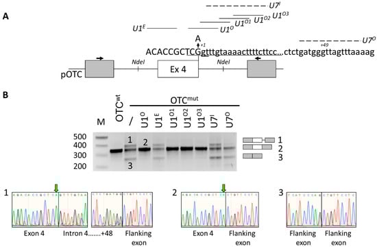 Among the OTC nucleotide changes reported in OTCD patients, those predicted to affect pre-mRNA splicing are generally associated with the most severe and early (neonatal) onset of the disease [,] and represent preferred candidates for RNA therapeutics []. Among these approaches, variants of the U1snRNA, the RNA components of the spliceosomal ribonucleoprotein U1RNP that drives 5′ splice site (5′ss) recognition, have been shown to rescue exon-skipping mutations in several cellular models of human disease [,,,,], and also in mouse models [,]. Importantly, different studies demonstrated that unique U1snRNAs targeting intronic sequences downstream of a defective exon (Exon specific U1snRNA, ExSpeU1) can rescue several exon-skipping mutations at 5′ss, 3′ss or within the exon, and this was proven both in vitro and in vivo [,,,,]. Very recently, we have provided the early proof of principle of efficacy in vivo of U1snRNA variants for another metabolic disorder, hereditary tyrosinemia type I []. In this animal model, the delivery of a compensatory U1snRNA partially rescued the causative splicing mutation at both RNA and protein levels and resulted in a slightly prolonged mice survival.