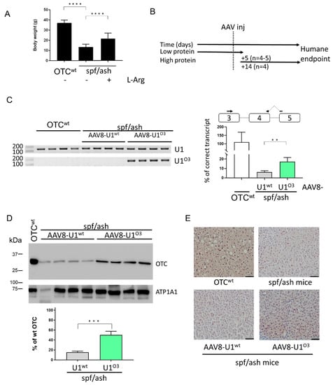 Prompted by the encouraging results in vitro, the U1O3 efficacy was challenged in the spf/ash mice by monitoring the level of OTC expression in the liver. Adult spf/ash male mice were initially kept on a low protein diet to avoid the development of a severe OTCD phenotype due to toxic ammonia levels. At 8–10 weeks, mice weighed 13 ± 2.8 g, while wild-type (wt) littermates kept on the same diet, gained weight more rapidly, and weighed 37 ± 2.9 g, confirming the growth impairment []. To maintain a normal rate of protein synthesis, spf/ash male mice were kept on low protein chow but supplemented with sucrose and L-Arginine, which led to a partial normalization of body weight (21 ± 5.5 g) (Figure 2A). Male mice were injected with 1 × 1013 vector genomes/kg of adeno-associated virus (AAV8)-U1wt (n = 9) or AAV8-U1O3 (n = 8) and challenged five or fourteen days later with a high protein diet (Figure 2B). Moreover, to provide evidence that the U1-mediated OTC rescue is mediated by the U1O3 binding and not by U1snRNP overexpression, the endogenous murine U1snRNA (U1wt) was exploited as control, also because both experimental groups shared the AAV transduction effects in hepatocytes, where the OTC expression is evaluated.