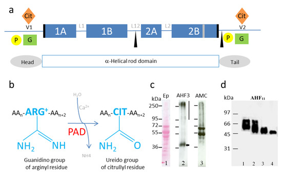 One of the post-translational modifications targeting the non-helical ends of IF proteins is deimination (or citrullination) (Figure 1a). Deimination is an irreversible reaction, catalyzed by a family of calcium dependent enzymes, called peptidylarginine deiminases or PADs (EC3.5.3.15) [8,30,31,32] (Figure 1b). This enzymatic reaction corresponds to the transformation of the guanidino group of an arginine residue (positively charged) into a ureido group, resulting in a citrulline residue (neutral), within a substrate protein (or a peptide). Some IFAP have also been shown to be modified by deimination (Table 2 and Figure 1c,d). This modification regulates their sensitivity to proteolysis [8,30,31,32,33] and their ability to be cross-linked by transglutaminases [34,35,36], which in turn modulates their structural organization following the loss of positive charges [13]. The first proteins demonstrated to be deiminated (or citrullinated) by PADs, identified by two-dimensional gel electrophoresis and immunodetection using a specific anti-modified citrulline (AMC) antiserum [17], were abundant proteins. They mainly corresponding to either constituents of IF or IFAP (Table 1).