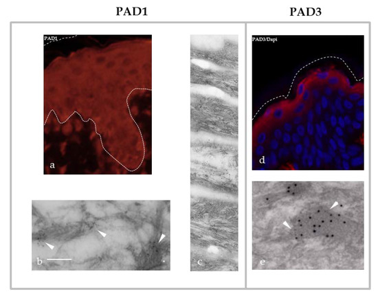 PAD1 is mainly expressed in the uterus and epidermis [41,52]. It has been detected, in particular by our team, in the cytoplasm of all human keratinocytes. In more differentiated living cells, the granular keratinocytes, PAD1 is associated with IF of keratins and located at the level of granular protein structures called keratohyalin granules [30,39,40,41] (Figure 2a–c). The keratohyalin granules have recently been described as dynamic structures, corresponding to liquid-like condensates able to undergo liquid-liquid phase separation during keratinocyte differentiation [53]. Their content, including filaggrin, is released in the transitional cell, just under the Stratum corneum, the most external part of the epidermis. Filaggrin is an IFAP that interacts with keratins and is a major protein for keratinocyte differentiation [9,10,11] (see also Section 4). Filaggrin is widely studied in the context of atopic dermatitis, because loss-of-function mutations of its encoding FLG gene are a major genetic risk factor for this common skin disease (also known as eczema) [12,54] (OMIM #605803 and #135940). Filaggrin is a substrate of PAD1–3, PAD1 showing the best in vitro capacity to modify this IFAP (Figure 1d) [39,41]. In human epidermis, PAD1 is also localized in all layers of corneocytes, anucleated and flattened cells derived from the differentiated keratinocytes and constituting the Stratum corneum, the protective horny layer of the epidermis. PAD1 is immunodetected at the level of the intra-corneocyte matrix, which is mainly made up of aggregated keratins [30,39,41] (Figure 2c). Recently, we showed, in a three-dimensional reconstructed human epidermis, that keratinocytes are able to adapt, in the absence of any other types of cells, to atmospheric dryness (relative humidity of 30–50%). Combined with an increased number of corneocyte layers, large amounts of PAD1 protein and mRNA and a markedly increased deimination in the Stratum corneum were observed [33]. Furthermore, in the context of tumorigenesis, PAD1 is significantly modulated and could be used as a biomarker [55,56]. For example, in triple-negative breast cancer, overexpression of PAD1 seems to be involved in the epithelial–mesenchymal transition and could promote metastasis [56].