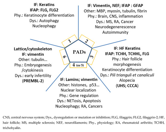 Thus, it is now clear that deimination, beyond other post-translational modifications, must be taken into account—especially during biochemical, proteomic or peptidomic analyses. PADs and deimination play a definite role in the fate of cellular proteins, in particular for IF and their IFAP, and beyond on the various protein networks (cytoskeleton, fibrin network, etc.) and their dynamics. The active involvement of deimination and PADs in the extracellular compartment remains to be explored and could open up new perspectives in pathophysiology. In the near future, it will certainly be essential to decipher their effects on the actin cytoskeleton, microtubules and adhesion structures. Deimination, as with many post-translational modifications, can lead to a loss (or a gain) of affinity of some antibodies (in particular, monoclonal antibodies). Let us not lose sight of this in our analysis and interpretation. Finally, a schematic summary is presented in Figure 4 to illustrate each PAD in physiological or pathological contexts.