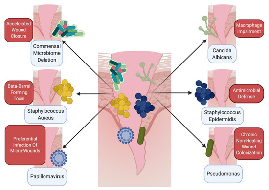 Host–microbe cross talk informs the immune microenvironment of wounds. A number of different microbes, including various bacteria, viruses, and fungi, can directly impact wound healing and alter the immune microenvironment. Upon wounding, whether by trauma, arthropod bite, or chronic barrier disruption, skin-resident bacteria, viruses, and fungi all can impact the microenvironment of the healing tissue. Several general and specific examples of this microenvironment interaction have been elucidated recently. Paradoxically, germ-free mice exhibit accelerated wound closure when compared to conventionally raised mice [54]. Other specific microbes have distinct effects on immune cells, including Staphylococcus aureus, which creates beta-barrel forming toxins to impair macrophage function in the wound [58], or Candida albicans, which also disrupts normal macrophage action [59]. While not a direct immune cell effect, other pathogens can impact the microenvironment, hijacking or colonizing wounds directly, including papillomavirus [60] and Pseudomonas species [61]. Skin commensal microbes such as Staphylococcus epidermidis can promote immune defenses in the wound [57] via phenol-soluble modulins. This provides a snapshot of the various roles of microbes in the wound microenvironment but is not exhaustive. Further study is needed to fully understand the skin microbiome–wound microenvironment interaction. Figure created using BioRender.