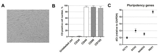 Human amniotic fluid-derived mesenchymal stem cells (AF-MSCs) characterization. (A) The typical morphology of human amniotic fluid-derived mesenchymal stem cells, grown in cell culture. Scale bar = 400 µm. (B) The expression of the main cell surface markers CD44, CD90, CD105, and CD34 as detected by flow cytometry. Unlabeled ctrl: unlabeled, undifferentiated control cells. Results are presented as the mean ± SD (n = 3). (C) The relative expression of pluripotency gene markers, namely, OCT4, SOX2, NANOG, and REX1, as determined by RT-qPCR. Data, relative to GAPDH, are presented as the mean ± SD (n = 3).