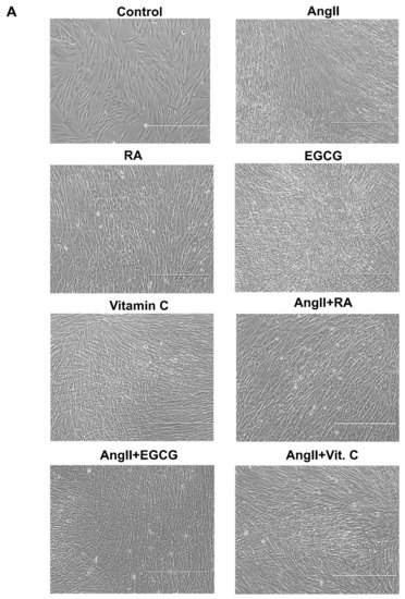 We and others have previously shown that AF-MSCs are capable of differentiating into cardiomyocyte precursors. One of the widely applied strategies is to use chemical agents, such as DNA methyltransferase (DNMT) inhibitors decitabine (5-aza-2′-deoxycytidine) and zebularine [6,7] or p53 inhibitor pifithrin-α [7] as cardiomyogenic differentiation inducers. However, they may be toxic to the organism and cause undesirable side effects [8]. Because of that, there is a growing interest in the search for natural, safe, and efficient inducers of cardiac differentiation. In our previous work, we have demonstrated that angiotensin II (AngII) and transforming growth factor β1 (TGF-β1), natural biomolecules found in various human tissues, are able to induce genetic, metabolic, and epigenetic alterations in AF-MSCs leading to the initiation of cardiomyogenic differentiation [9]. These natural differentiation inducers are not the only substances able to initiate cardiac differentiation; all-trans retinoic acid (RA) was demonstrated as an efficient agent causing cardiomyogenic differentiation of mouse embryonic stem (ES) cells [10,11]. In addition, vitamin C, also known as ascorbic acid, was used to generate beating cardiomyocytes from mouse ES cells [12,13,14,15] or from induced pluripotent stem cells [16] and even for transdifferentiation of mouse fibroblasts to cardiomyocytes [17]. We also tested epigallocatechin-3-gallate (EGCG), a polyphenol extracted from green tea, which is a widely used antioxidant having DNMT and histone deacetylase (HDAC) inhibitory properties [18]. EGCG was demonstrated to have antiadipogenic features and potential for obesity treatment [19], as well as anticancer, anti-inflammatory, anticollagenase, antifibrosis, and osteogenesis promotion effects in cancer and stem cells [20,21,22]. Furthermore, EGCG was successfully applied after myocardial infarction and reduced the infarct volume and size, as well as inhibited cardiac myocyte apoptosis and oxidative stress [23,24,25,26] and even enhanced adipose tissue MSC differentiation into endothelial progenitor cells [27], suggesting its potential as a cardiac differentiation inducer. Thus, we aimed to observe the effect of these agents and their combinations with angiotensin II on cardiomyogenic differentiation induction of human AF-MSCs and to evaluate the processes in the cells during the induced differentiation.