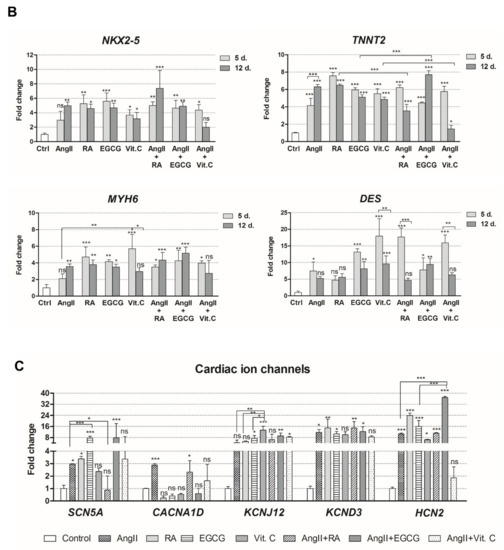 In this study, we sought to explore the potential of AF-MSCs to differentiate into cardiomyocyte progenitors using several natural biologically active compounds, namely, angiotensin II, retinoic acid, EGCG, vitamin C, and their combinations. We previously demonstrated that angiotensin II is able to induce alterations in human AF-MSCs at various levels (genetic, metabolic, and epigenetic) leading to the initiation of cardiomyogenic differentiation [9]. As our results demonstrated for the first time, RA, EGCG, and vitamin C, as well as their combinations with angiotensin II, were also able to initiate cardiac differentiation of AF-MSCs, albeit to a different extent. Our results are in agreement with Wobus and colleagues [10] showing that retinoic acid influenced the differentiation efficiency of mouse ES cells into the cardiomyogenic lineage. Furthermore, RA treatment specifically increased the number of ventricle cardiomyocytes [11]. Interestingly, the morphology of our RA-treated AF-MSCs differed the most from other induced cells, possibly due to the different nature of cardiomyocyte progenitors. Vitamin C also caused the upregulation of cardiac-specific genes (transcription factor NKX2-5), cardiac muscle-specific genes (MYH6, TNNT2, and DES), and cardiac ion channel genes (SCN5A, CACNA1D, KCNJ12, KCND3, and HCN2), consistent with previous studies using stem cells from several different sources [12,16,34]. Vitamin C was also demonstrated as the enhancer of the yield of beating cardiomyocytes [14,15,16,17], but we did not detect any spontaneous contractions in our induced AF-MSCs. Surprisingly, EGCG, the compound with a huge action potential for different treatments [20], was not previously tested as a direct cardiomyogenic differentiation inducer. However, EGCG was successfully applied in vitro as an inducer of endothelial differentiation of adipose tissue MSCs [27] or in vivo for cardiomyopathy or infarct treatment and enhanced cardiac function restoration [35], where it reduced the infarct volume [25,26] or decreased the infarct size and inhibited cardiac myocyte apoptosis [23,24]. As our results indicated, EGCG was equally efficient to other tested agents at the gene expression level during the induced differentiation. In addition, in most cases, we did not detect any additional effect using combinations of RA, EGCG, and vitamin C with angiotensin II compared to angiotensin II or these agents alone.