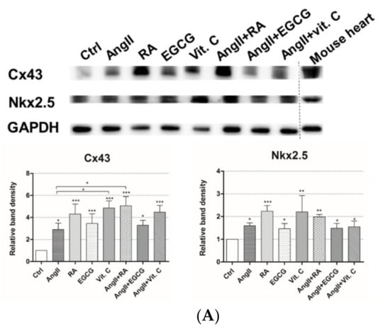 This was also demonstrated at the protein level. The levels of Connexin 43 (Cx43) protein, the main component of cardiac gap junctions, were enhanced in AF-MSCs, induced with all differentiation agents, on the 12th day after differentiation in agreement with the high levels of Cx43 in adult mouse heart (Figure 3A). The highest increase in Cx43 levels was detected in RA-, vitamin C-, AngII + RA-, and AngII + Vit. C-induced cells. Analysis of Cx43 levels and localization using immunofluorescence matched the Western blot results, showing the increased amount of this protein in induced cells (Figure 3B). The majority of Cx43 was diffused throughout the cells; on the other hand, a minor fraction of Cx43 that was distributed at the boundaries of AF-MSCs may indicate the beginning of the formation of gap junctions. Moreover, Nkx2.5, the early cardiac transcription factor, was evaluated not only at the gene but also at the protein level. As Western blot results uncovered, the levels of Nkx2.5 were upregulated in AF-MSCs differentiated with all biomolecules or their combinations, especially in RA-treated cells concomitant to a high amount of Nkx2.5 in the mouse heart (Figure 3A). Immunofluorescence data complemented Western blot results, demonstrating that the amount of Nkx2.5 was enhanced, and it was mostly localized in the nuclei of differentiated cells (Figure 3C).