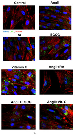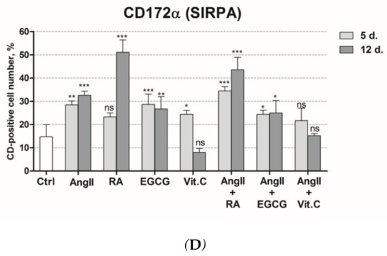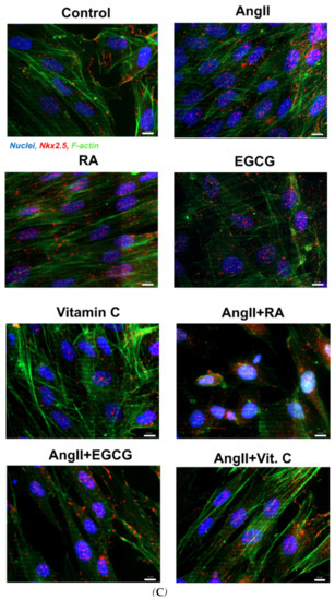 Furthermore, we evaluated the expression of cardiomyocyte surface marker CD172α (SIRPA) on AF-MSCs differentiated toward the cardiac lineage on days 5 and 12 (Figure 3D). As flow cytometry data revealed, CD172α expression increased on all induced AF-MSCs compared to undifferentiated control cells. On AngII-, RA-, and AngII + RA-treated cells, the levels of CD172α gradually raised from the beginning of differentiation until day 12. AF-MSCs, induced with EGCG and AngII + EGCG, maintained similar levels of this surface marker during differentiation, while, on AF-MSCs induced with vitamin C and AngII + Vit. C, the expression of CD172α decreased as differentiation proceeded. Nevertheless, successful initiation of cardiac differentiation of AF-MSCs was also confirmed at the protein level.