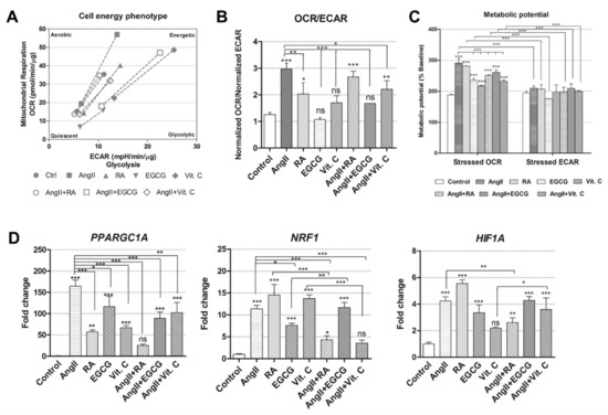 Together with alterations in metabolism and energetics, the expression of several genes, associated with metabolism regulation, was measured using RT-qPCR (Figure 4D). PPARGC1A (peroxisome proliferator-activated receptor gamma coactivator 1 alpha) was upregulated in all induced cells except for AngII + RA, whereas angiotensin II caused the highest increase in expression. All differentiation inducers except for AngII + Vit. C caused an increase in the expression of NRF1 (nuclear respiratory factor 1), and HIF1A (hypoxia-inducible factor 1-alpha) was upregulated in AF-MSCs treated with all agents except vitamin C.