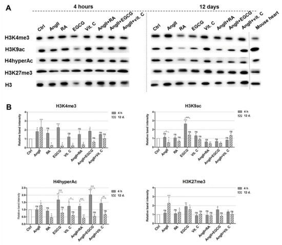Epigenetic alterations during the induced cardiomyogenic differentiation. (A) Total proteins were extracted from control cells (Ctrl) and cells induced using AngII, RA, EGCG, vitamin C, and their combinations, 4 h and 12 days after the induction of differentiation. Alterations in the levels of modified histones considered as markers of an active chromatin state (H3K4me3, H3K9ac, and H4hyperAc) and markers of a repressed chromatin state (H3K27me3) are presented as determined by Western blot. Mouse heart lysate was used as a positive control. The blots represent one of three independent experiments showing similar results. (B) The relative band density of modified histones measured using ImageJ software (NIH, USA) and normalized to the H3 loading control. The data are presented as the mean ± SD (n = 3); p ≤ 0.05 (*), p ≤ 0.01 (**), p ≤ 0.001 (***), ns: nonsignificant.