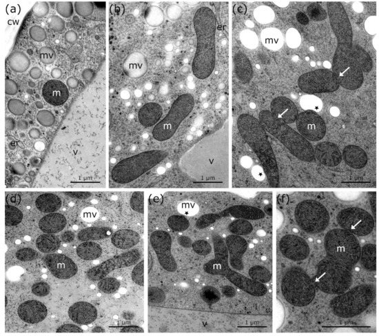 TEM micrographs of mitochondria in Micrasterias denticulata cells during cold stress in comparison to controls at +20 °C. (a) Control at +20 °C with round, solitary mitochondrion and single mucilage vesicles. (b) +4 °C, 24 h chilling treatment with elongated mitochondria and slightly bloated endoplasmic reticulum. (c) +4 °C, 3 weeks treatment with elongation, aggregation, and fusion of mitochondria (arrows) and protrusion of mitochondria into mucilage vesicles (asterisks). (d) −2 °C freezing (without ice) treatment—elongation and aggregation of mitochondria visible. (e) −2 °C, extracellularly frozen cell with elongation and aggregation of mitochondria and protrusion of mitochondria into mucilage vesicle (asterisk). (f) Higher magnification of −2 °C, extracellularly frozen cell shows attachment and fusion of outer mitochondrial membrane (arrows) as well as aggregation to mitochondrial network. m: mitochondria, mv: mucilage vesicles, v: vacuole, cw: cell wall, er: endoplasmic reticulum.