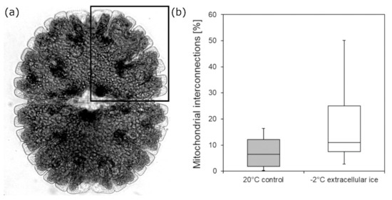 (a) Schematic depiction of the analyzed area in Micrasterias. (b) Mitochondrial fusions and contacts (%) in Micrasterias denticulata during extracellular freezing stress at −2 °C in comparison to controls at +20 °C determined by analysis of TEM micrographs (n = 10). Mean values were not significantly different (p = 0.069; t-test). Boxes indicate the median (horizontal line inside the box) and the 25th and the 75th percentile (bottom and top border). Whiskers indicate maxima and minima and extend maximum to 1.5 times box-height.