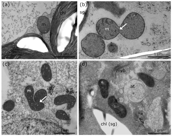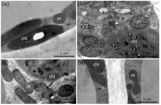 It is known from several observations (see references [21,22,23] and others), that cell organelles and compartments may alter and interact structurally during stress. In a recent study [24], structural changes of the cell wall and alterations in organelle distribution were observed in the early branching streptophyte alga Klebsormidium crenulatum (Klebsormidiophyceae) during freezing stress. In the late branching streptophyte alga Micrasterias (Zygnematophyceae, Desmids) for example, the fusion of mitochondria to local networks was observed during ionic stress [22] and the degeneration of dictyosomes occurred as a consequence of cadmium stress [25]. However, only few studies have focused on structural alterations of organelles in plant cells during cold stress so far [5,7,26].