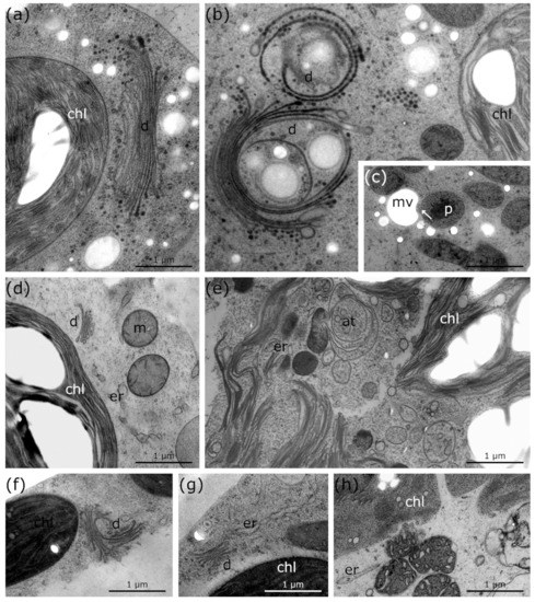 - Aichinger, N.; Lutz-Meindl, U. Organelle Interactions and Possible Degradation Pathways Visualized in High-Pressure Frozen Algal Cells. J. Microsc. 2005, 219, 86–94. [Google Scholar] [CrossRef]