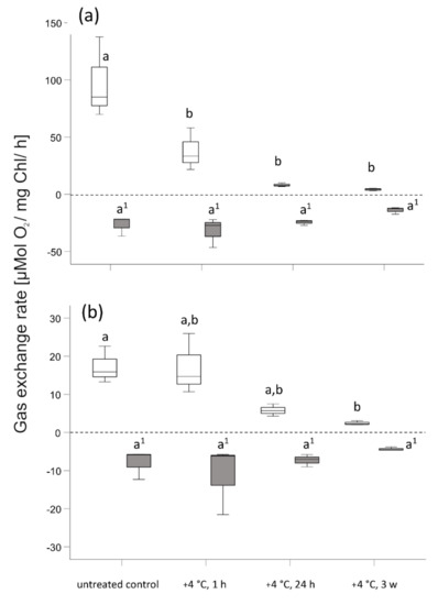 Photosynthetic oxygen production (apparent photosynthesis, open boxplots) and dark respiration (grey boxplots) of (a) Micrasterias denticulata and (b) Lemna sp. after 1 h, 24 h, and 3 weeks of chilling stress at +4 °C. Each boxplot relates to 3 independent biological replicates (n = 3). Different letters (a, b) indicate significant differences between means (p < 0.05). Letters with superscript numbers (a’, b’) are related to the dark respiration rate Rd. (One-way ANOVA followed by Duncan’s and Games Howell’s test). Boxes indicate the median (horizontal line inside the box) and the 25th and the 75th percentile (bottom and top border). Whiskers indicate maxima and minima and extend maximum to 1.5 times box-height.