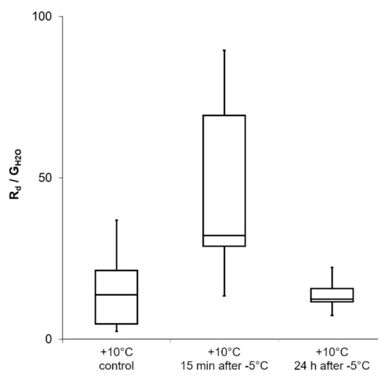 Dark respiration rate in dependence on diffusive conductance (Rd/GH2O) measured on R. glacialis leaves (Figure 8) was apparently but not significantly (p > 0.05) increased when determined at +10 °C 15 min after exposure to freezing stress at −5 °C. 24 h after freezing at −5 °C, when R. glacialis leaves recovered at +10 °C, mean Rd/GH2O equals control values.