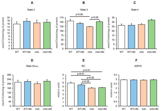 2.1. Effect of Deflazacort Administration on Respiration and Oxidative Phosphorylation of Skeletal Muscle Mitochondria of Dystrophin-Deficient and WT Mice