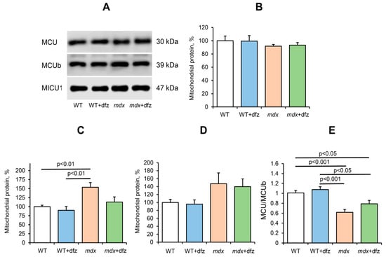 - Dubinin, M.V.; Talanov, E.Y.; Tenkov, K.S.; Starinets, V.S.; Mikheeva, I.B.; Sharapov, M.G.; Belosludtsev, K.N. Duchenne muscular dystrophy is associated with the inhibition of calcium uniport in mitochondria and an increased sensitivity of the organelles to the calcium-induced permeability transition. Biochim. Biophys. Acta Mol. Basis Dis. 2020, 1866, 165674. [Google Scholar] [CrossRef]