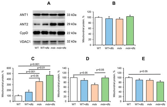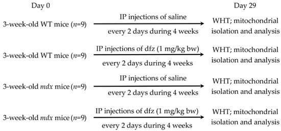 - Ascah, A.; Khairallah, M.; Daussin, F.; Bourcier-Lucas, C.; Godin, R.; Allen, B.G.; Petrof, B.J.; Rosiers, C.D.; Burelle, Y. Stress-induced opening of the permeability transition pore in the dystrophin-deficient heart is attenuated by acute treatment with sildenafil. Am. J. Physiol. Heart Circ. Physiol. 2011, 300, H144–H153. [Google Scholar] [CrossRef]