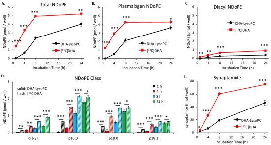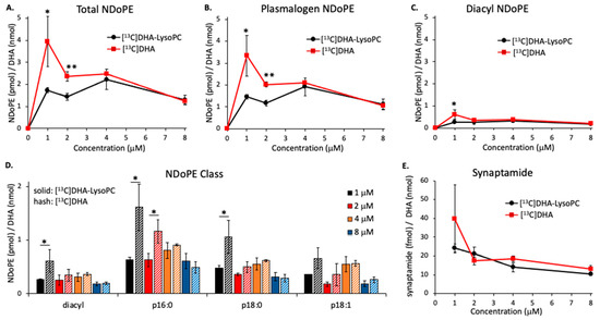 Comparative production profile of total NDoPE (A), pNDoPE (B), diacyl NDoPE (C), NDoPE molecular species (D), and synaptamide (E) from either [13C]-labeled DHA or DHA-lysoPC after normalization for cellular DHA incorporation based on the data shown in Figure 3 * p < 0.05; ** p < 0.01.